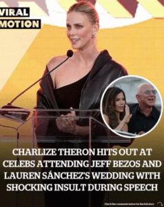 Charlize Theron has stirred controversy after making a blunt and unexpected comment during a recent speech that appeared to target celebrities attending Jeff Bezos and Lauren Sánchez’s much-anticipated wedding. The Oscar-winning actress, known for her fierce independence and no-nonsense personality, reportedly did not hold back when discussing what she called the “circus of wealth and vanity” surrounding the high-profile couple’s nuptials.