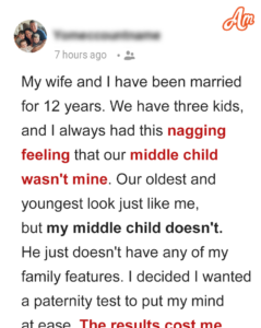 A father, concerned that his middle son didn’t resemble him as much as his other children, requested a DNA test to confirm paternity. The results revealed that the child was indeed his biological son. Despite this confirmation, the request for the test caused significant strain in the family, leading to potential marital issues.